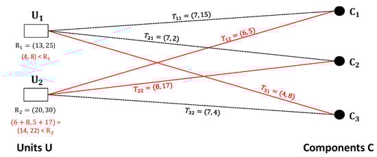 Figure 1 demonstrates an example of a component allocation problem. There are three components (), two units (), and two resources (). The problem can be converted to a bipartite graph with different vectors or resources as weights on each edge. The resource capacity and consumptions are annotated by a vector notation for brevity. For instance, . A concrete allocation is represented by red solid lines. The allocation sets , , to one, and all other entries in to zero. The resource capacity of Unit 1 is not violated since and as well as the capacities of Unit 2 and . Thus, this is a feasible component allocation with . For the single-objective scalarization with this results in .