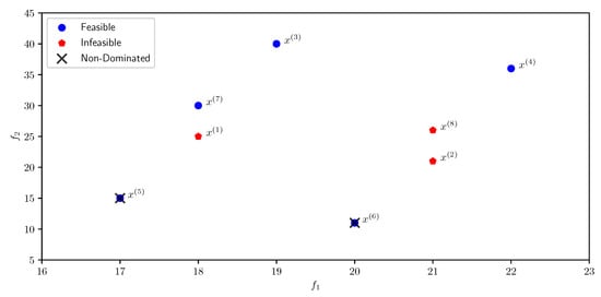 Table 1 shows the set of all possible allocations in the component allocation problem example. For each allocation, the table shows whether it is feasible. In addition, it shows the values for and . The Pareto-optimal solutions are in bold (Allocations 5 and 6). Note that Allocation 5 is the optimal solution in the case of single-objective CAP optimization. Figure 2 presents an overview of the possible allocations as depicted in the objective space.