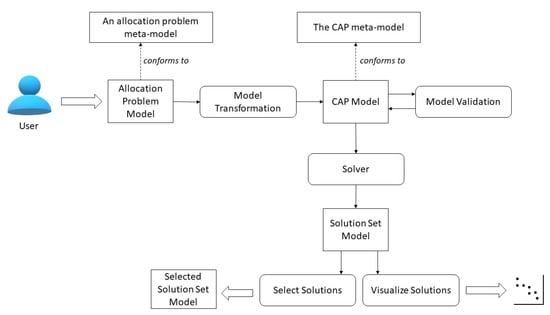 Most of the steps outlined in the proposed methodology are supported by a toolset. The toolset consists of Python scripts for reading CAP models, solving the optimization problem in both single-objective and multiple-objective cases, and generating optimal allocation models. PyEcore framework [] is used to read the CAP models and generate the output models. Other scripts are used for visualizing the optimal allocations. The Python scripts are available on GitHub at https://github.com/julesy89/pyallocation (accessed on 15 November 2021). In addition, CAP models can be validated by running the Java program (also available on the same GitHub repository mentioned above) using a command line.
