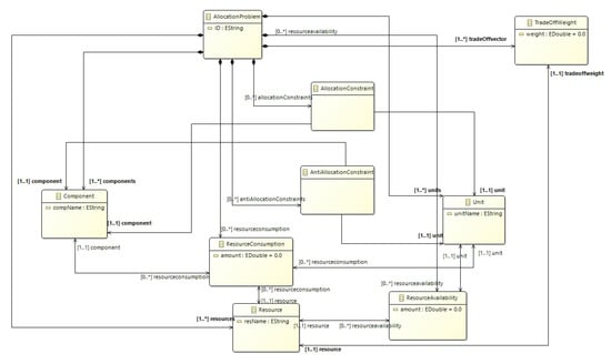 The source meta-model in [] accommodates the definition of software component allocation problems in embedded, heterogeneous systems. The meta-model assumes that there exist three resources provided by the computational units: CPU, memory, and power. In the meta-model, there is a TradeOffVector element that is used to define the trade-off weights assigned to the three resources. These weights are used to define the single-objective function used by the component allocation problems considered in []. The meta-model is defined in Ecore [].