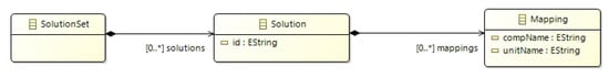 The solution set meta-model is shown in Figure 5. A SolutionSet is composed of a number of Solutions. Each Solution has an id and is composed of Mappings. Each Mapping maps a component to a unit. The optimal solutions to a CAP are represented using a SolutionSet. If there is no solution, the SolutionSet is empty.