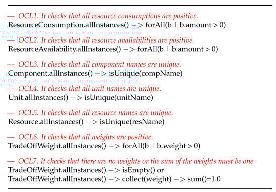 The CAP model can be validated before using the solver. Figure 6 shows several assertions in object constraint language (OCL), which can be automatically checked against a CAP model. The assertions are not designed to capture syntactic or type-related issues in the CAP model; instead, they are used to find logical errors such as non-unique names and negative values for resource availabilities. In order to check for syntactic and type-related errors, several available tools can be used.