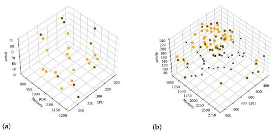 Figure 8 shows the Pareto fronts obtained by the multi-objective optimization of Systems 1 and 9. Without loss of generality and due to space constraints, we only include the results for these two systems. The scatter plots in the figure present visualizations of the objective space showing the non-dominated solutions in the Pareto fronts. For System 1, we implemented an exhaustive search algorithm to determine the Pareto front. The non-dominated solutions found by the exhaustive search method are colored in orange. On the other hand, the non-dominated solutions found by using our framework are marked with the character x. The Pareto fronts for System 1 are shown in Figure 8a. The figure shows that the set of non-dominated solutions found by our framework is a subset of the set of non-dominated solutions found by the exhaustive search method. Although our framework may not find all non-dominated solutions, it finds a good mix of non-dominated solutions that are distributed across the objective space of feasible solutions.