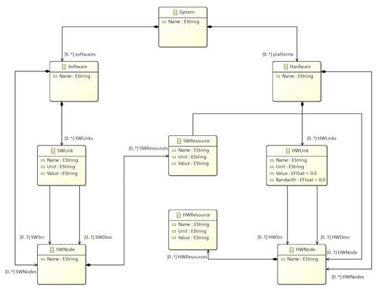 In the second set of experiments, we apply our framework in solving allocation problems represented as models conforming to the meta-model of the SCALL tool []. This tool consists of two main parts: an editor that is used to create the models and a Python script, called PyAllocator, which is used to solve the allocation problem by employing a multi-objective heuristic allocation method. SCALL is implemented as an Eclipse plug-in and has been used in solving allocation problems in the research literature (for example, see the work of Švogor et al. []). Figure 9 shows the SCALL meta-model, which was adapted from []. The details of the meta-model can be found in []. We note that the meta-model does neither include elements for defining the weights nor the architectural constraints in a CAP.