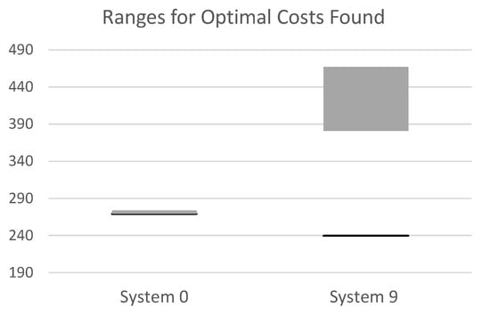 Figure 10 shows optimal cost results obtained in 10 different runs. In the figure, the ranges for the approximated optimal costs (as found by SCALL) are represented as gray rectangles delimited by the minimum and maximum values in the different runs for each system. In addition, the figure shows the optimal cost for each system obtained using our framework as a solid black line. With regards to the execution times, for System 9, the 95% confidence interval for the execution times was 0.19447 ± 0.0022941 (the unit is in seconds) in the case of using the PyAllocator script and 0.16861 ± 0.0041780 in the case of using our framework.