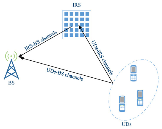 An FL system with IRS is considered as shown in Figure 1, where an IRS, composed of N reflective elements, deployed in the system to assist the communication between a single-antenna BS and K single-antenna UDs. UDs and reflective elements are indexed by and . In the FL system, after receiving the global model from the BS, UDs train it to obtain the local models using the local dataset. Then, the local models are sent to BS to be aggregated into a new global model. This process is repeated until the accuracy of the learning model is reached. Specifically, the process can be divided into three steps, which are “local model computation”, “local model transmission”, and “global model aggregation and broadcast” [19,20]. The details are as follows: