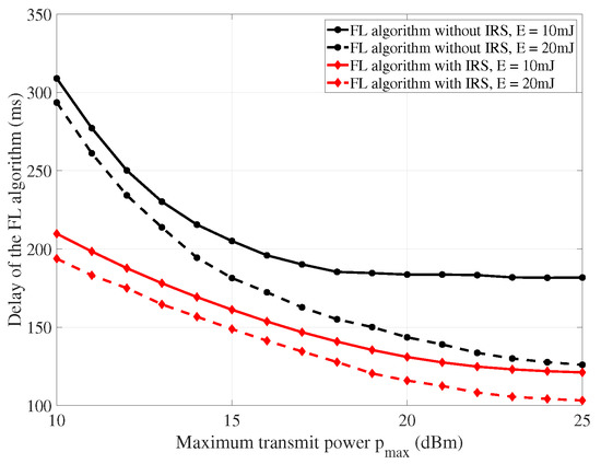 Figure 2 describes the delay versus the maximum transmit power with different energy consumption limits. It is shown that the delay of the FL algorithm decreases as the maximum power increases. This is because that the low transmit power leads to a narrow feasible set of the optimization problem and the feasible set increases as the maximum power increases. Compared with “FL algorithm without IRS”, the delay decrease in “FL algorithm with IRS” is up to 32%. In addition, we also found that the scheme with more relaxed energy consumption limits consumes less time.