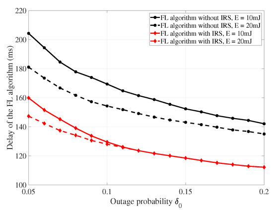 Figure 3 presents the relationship between the delay and the outage probability. It is obvious that the delay of the FL algorithm decreases as the outage probability increases. This is because that the quality of service is sacrificed in order to increase the communication rate. As the communication rate increases, the energy consumption becomes less and less. Therefore, the delay gap between the algorithm with mJ and mJ becomes less.