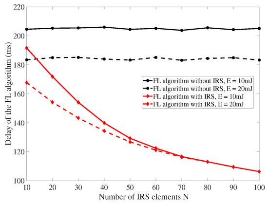 Figure 4 presents the relationship between the delay and the number of the IRS elements with different energy consumption limits. It is obvious that there is a performance gap between the “FL algorithm with IRS” and “FL algorithm without IRS”, and it increases with the number of the IRS elements increase. This is because that the IRS lead to a reflection-based beamforming gain, which increases as the number of IRS elements increases. Compared with “FL algorithm without IRS”, the time reduction by “FL algorithm with IRS” is up to 48% with mJ and .