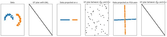 From left to right: Data (moons); OT plan obtained with GW for ; Data projected on the first axis; OT plan obtained between the projected measures; Data projected on their first PCA component; OT plan obtained between the the projected measures.