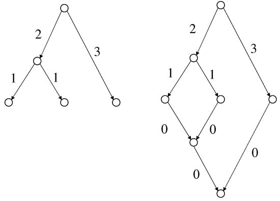 Let F be a canonical estimate for G, as shown in Figure 4. The proposition is obvious when . Suppose that . We can consider each i separately. By Lemma 2, and are unique up to their exchange. Therefore, the length of F in is also the same in any canonical estimate. By the induction hypothesis, any canonical estimate for has the same characteristic vector, and therefore any canonical estimate for G has the same characteristic vector as well. □