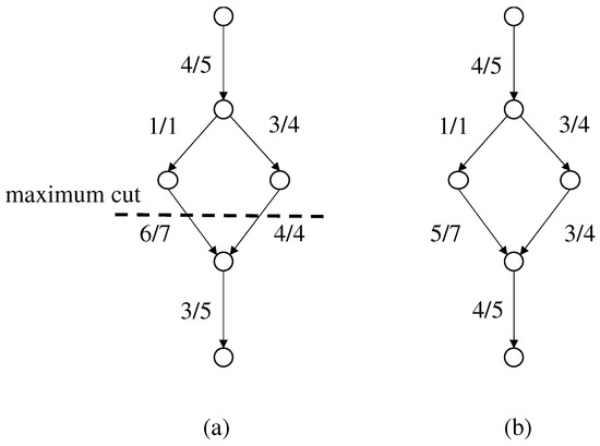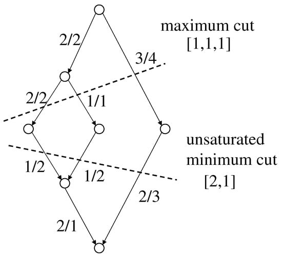 In this section, we introduce a special class of estimates, called canonical estimates, that gives optimal estimates. We first introduce some terminology. An edge is called saturated if , and is called unsaturated if . A cut is a subset of edges such that it contains exactly one edge on every goal path. Let F be the characteristic vector of an estimate. Then, the characteristic vector of a cut is the restriction of F to the edges in the cut. A cut is called maximum if its characteristic vector is maximum with regard to ⪯ in all cuts. A cut is called unsaturated if it consists of unsaturated edges only. An unsaturated minimum cut is an unsaturated cut such that its characteristic vector is minimum with regard to ⪯ in all unsaturated cuts. Figure 3 shows a maximum cut with characteristic vector and an unsaturated minimum cut with characteristic vector [2, 1].