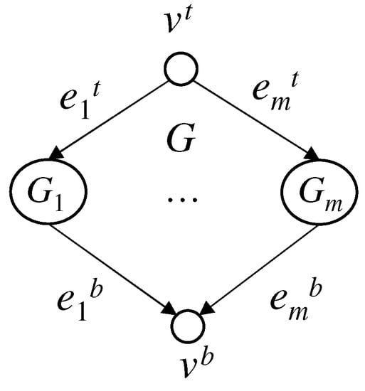 Each edge is called a top edge of G and each edge is called a bottom edge of G. An FJ-DAG has a nested structure. We introduce the level of an FJ-DAG G, denoted by , as follows: (i) the level of a single vertex G is 0; (ii) if are children of G, then . Any FJ-DAG contained in an FJ-DAG G as a subgraph is called a sub FJ-DAG of G. Figure 1 shows an FJ-DAG, where the level of each sub FJ-DAG is indicated. We also define the level of each edge. The level of an edge is defined as the level of a sub FJ-DAG that contains the edge as a top or bottom edge. Such a class of graphs is well studied in the research field of queuing networks since it appears in various applications such as parallel computing and flexible manufacturing systems [17].