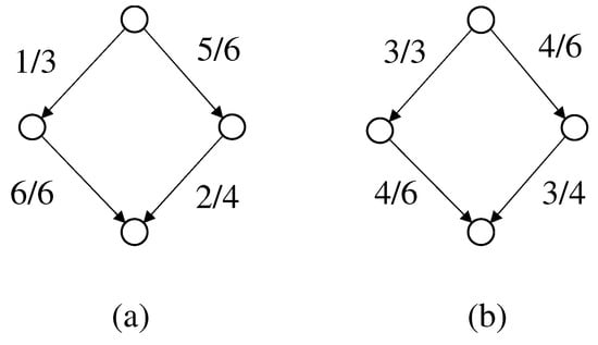Reassignment for violation of C4: (a) before the reassignment, (b) after the reassignment (for each edge , is indicated).