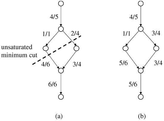 Violation of C2: Let be a sub FJ-DAG in which C2 is false. This means that () is unsaturated and (). Then, increment () by one and decrement () by one (see Figure 5).