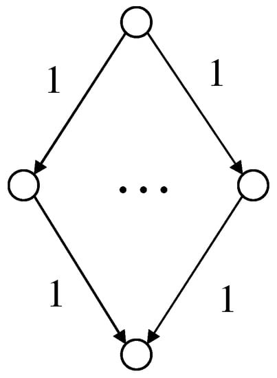 There exists an FJ-DAG for which any rational strategy gives waste fail calls; i.e., is the tight upper bound for rational strategies. Let us consider an FJ-DAG shown in Figure 9, where every edge has length 1. At each round, any rational strategy picks up one unsaturated edge on a goal path with the shortest estimated length and issues an oracle call to it. Then, we will eventually reach the following situation: all edges are saturated but are in . The next oracle call is issued to some edge and it succeeds. Then, we consider an instance having a length of 2 for this edge. The strategy shows the same behavior for the new instance before this oracle call, but now the oracle call fails. Since the strategy is rational, the next oracle call is issued to an edge on a goal path with an estimated length of 2. We can repeat this times. After that, we obtain a goal path with a length of 2 such that all edges on it are in . When a terminal estimate is obtained, the number of waste fail calls issued so far is . Hence, we have the following result.