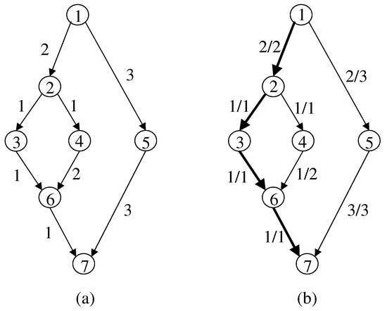 Reassignment for violation of C2: (a) before the reassignment, (b) after the reassignment (for each edge , is indicated).