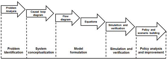 The System Dynamics (SD) methodology was developed by Jay W. Forrester [18]. SD was originally introduced to facilitate the understanding of industrial processes. SD is used as a methodological approach to explain the effects of decisions in complex dynamic systems. The SD approach emphasizes time functions [19,20]. SD Models undergo constant interaction, continuous questioning, testing, and refinement. Based on the feedback concepts of control theory, the SD methodology generates the dynamic behavior of the associated model. The feedback loop structure of systems is represented by causal loop diagrams (CLD) [19,21]. A feedback loop contains two or more causality-related variables that are self-contained. The variable relationships in the loop can be either positive or negative. A positive relationship means that when one variable increases, the other one increases, too. In a balanced relationship, the change in the variables is inverse. The stock and flow diagram (SFD) is the underlying physical structure of the system. The SFD is normally structured according to the CLD. The stock (level) represents the state of the system and the flow (rate) is changed by decisions based on the state of the system. The stock and flow structure (including feedback) of a system determines the quantitative modes of behavior that the system can adopt. For the development of an SD model, the work in [19] presents a modeling process with the following steps: (i) problem analysis, (ii) system conceptualization, (iii) model formulation, (iv) simulation and verification, and (v) policy analysis and improvement. Figure 1 illustrates the SDSM process.