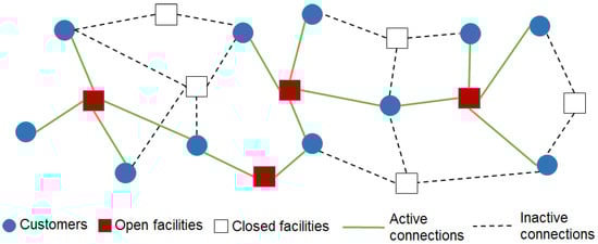 In a basic formulation, the FLP consists of a number of potential plant locations at which a plant can be opened and a number of demand points that must be served. The aim is to determine what subset of facilities needs to be opened in order to minimize the total costs of delivering goods to customers plus the sum of the facility opening costs. A simple example of a classic FLP instance is shown in Figure 2, where each customer (blue circle) is assigned to the nearest open facility (red square) via an active connection.