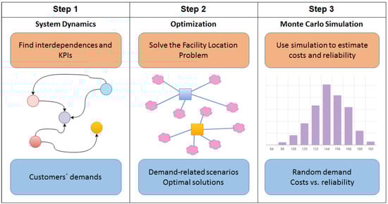 In particular, our approach consists of the following steps, which are shown in Figure 3: (i) for each district, we use the SDSM to generate an estimate of expected demand; (ii) for different scenarios, each scenario being defined by a different level of demand (e.g., lower than expected, as expected, or higher than expected), solve the associated CFLP model; and (iii) use a Monte Carlo simulation to evaluate the solutions obtained in the previous step when used in a stochastic environment. Here, we assumed that the demand per district is uncertain and follows a known probability distribution, with the aim of comparing total costs with the reliability.