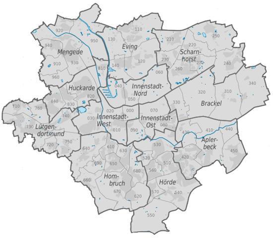 This paper deals with the case of the city of Dortmund, which is divided into 62 districts, codified from 000 to 960. Figure 4 shows the map of the city of Dortmund with its respective districts.