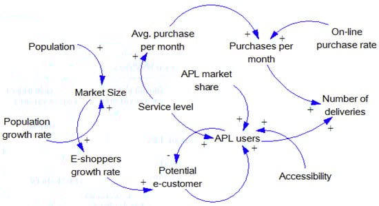 The CLD describes that the market size is positively influenced by the population and the population growth rate. The potential number of e-customers is positively influenced by the e-shoppers growth rate and balanced by the number of APL users. In turn, the number of deliveries is positively reinforced by purchases per month and number of APL users. In turn, the purchases per month are positively reinforced by the average purchases per month and the online purchase rate.