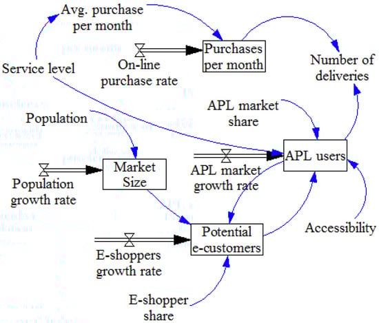 From a quantitative perspective, we present the evaluation of the APL components. Based on the CLD, we built the SFD, as shown in Figure 6. First, the variables of market size, potential e-customers, purchases per month, and APL users are defined as stocks (squared). Then, population growth rate, e-shoppers growth rate, online purchase rate, and APL market growth rate are defined as flows. Finally, population, accessibility, service level, average purchase per month, APL market share, and number of deliveries are auxiliary variables. The main output in this model is the number of deliveries, which are used as input values in the FLP model.
