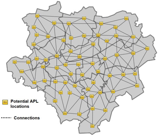 The FLP is a well-known optimization challenge where the typical goal is to find the minimum costs and location of facilities that must be open to meet customer requirements, either deterministically [30] or stochastically [31,49]. If routing decisions are also included, the FLP turns into the so-called location routing problem [50,51]. In general, FLPs are classified either as capacitated or uncapacitated. The former refers to the case where the facilities have a known limit to the demand they can meet. The latter is the case where the service capacity of each facility exceeds the total demand of customers. Figure 7 illustrates the capacitated FLP (CFLP) for the APL network in the city of Dortmund. Here, each district is a potential APL location (yellow square) and each APL is connected to each other in the APLs configuration (dashed lines). These connections are used to calculate the distance matrix between districts.