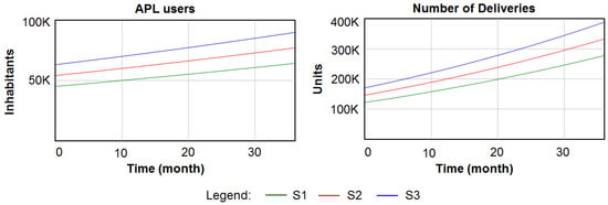 The market size increases in line with the population growth rate from from 602,666 in month 1 to 606,182 inhabitants in month 36. The purchases per month, the number of deliveries and the number of APLs show an increasing trend over time. The number of deliveries increases from to packages per month. We applied the SDSM and changed the average purchases per month as shown in Table 2. The results for APL users in the first month are 45,666 for , 54,799 for , and 63,933 for , and at the 36th month 64,331 for , 77,202 for , and 90,071 for . The results of the number of deliveries (units) in the first month are 125,353 for , 150,423 for , and 175,496 for , and in the 36th month 277,910 for , 333,512 for , and 389,106 for . Figure 8 illustrates the scenario comparison of the users of APL and the number of deliveries. The complete results generated by the SDSM of the default scenarios are shown in Table A1, Table A2 and Table A3 in Appendix A.