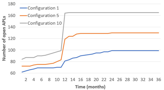 The variable costs are proportional to the distance between each pair of districts. They were estimated using a web mapping service. The fixed costs are € for the first year and each district, and increase according to an average inflation rate of per year. The capacity of each APL in a district is units per month, and the minimum utilization percentage is . Then, our CFLP model is solved with Cplex for all ten configurations. The number of resulting open APLs per month is shown in Figure 9 for three out of these configurations. The lowest and highest lines represent solutions for the lowest and highest demand, respectively. The rest of the solutions are in between. As the demand increases over time, the number of open APLs will behave the same regardless of the configuration. However, this consistent behavior does not extend beyond the year 1 for and beyond the year 2 for and , when the total installed APLs are sufficient to cover the total demand by the end of the planning horizon. Furthermore, there is a sharp increase in open APLs from months 11 to 12. This behavior is caused by two parameters: The annual growth of the fixed costs drives the APLs that are opened when they are less expensive, but always limited by the minimum utilization percentage m. Finally, the total number of APLs installed varies significantly from one scenario to another, for example, while 165 APLs are required for , only 99 APLs are installed in the configuration at the end of the planning horizon. All configuration results are stored in Table A4, Table A5 and Table A6 in Appendix B.