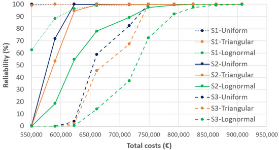 In general, configurations are less reliable when demand scenarios are increased. For example, configuration , with total costs of 661,100€, only achieves a reliability level of under the high demand scenario and a log-normal distribution. Conversely, this configuration achieves a reliability level of under the low demand scenario. Furthermore, the reliability is very sensitive to the probability distribution. Broadly speaking, a configuration fails if the demand is too high (Equation (9)). Therefore, configurations simulating a log-normal demand, which has no upper limit, are less reliable than those where the probability distribution is either uniform or triangular (Equations (10) and (11)). This fact underlines the relevance of integrating the study to determine the behavior of demand in the real case.