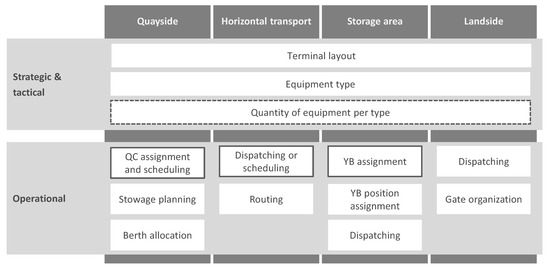 These decision problems influence each other [6]. For example, berth allocation directly influences the YB assignment and vice versa. The distances between the ship at the berth and the assigned YBs should be as short as possible, and at the same time, sufficient YBs should be assigned to a berth or QC. RTGs in the yard can typically move 15 containers within one hour, while QCs have a productivity of around 30 moves/h. Thus, at least two YBs (each being served by at least one RTG) have to be connected to one QC. Another example is the relationship between gate organization and dispatching in the yard: If the number of truck arrivals is regulated by a truck appointment system, then this also influences the number of handling orders for RTGs and thus affects dispatching [7]. These are just two examples of the numerous interactions between decision problems. Therefore, there is a risk that the overall solution will deteriorate if only one decision problem is optimized. Hence, it is necessary to combine the different related decision problems into a single integrated decision problem. Usually, the operations on the waterside are focused on due to the high costs related to the berth time of a ship. This means that the number of QCs, YTs, and RTGs as well as the integration of the handling processes need to be jointly considered to ensure efficient operations. Thus, this study analyzes a combination of QC assignment and dispatching, as well as YB assignment as shown with a dark frame around the respective boxes in Figure 1. Additionally, the dashed frame around the quantity of equipment per type indicates that the number of YTs used is modified.