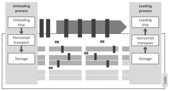 Seaports are the interface between various transport modes in the maritime supply chain. In 2019, the volume of global maritime containerized trade had tripled to 152 million TEU (Twenty-foot Equivalent Unit, the size of a standard container) from its value in 1997 [1]. Moreover, ship sizes have also tripled in the past 20 years, from an 8000 TEU capacity to around 24,000 TEU. This implies that, in addition to adjustments to the port’s infrastructure and superstructure, container terminals have to substantially increase their efficiency in ship handling in order to keep unproductive berthing times as short as possible while container volumes that are handled during one ship call increase. Thus, the challenge for terminals is to handle a large number of containers within a very short period of time. Terminals can address this challenge by creating technical prerequisites (i.e., using more and higher-performance equipment) and by optimizing operational processes. While the use of more equipment entails correspondingly more investment and higher running costs, intelligent control of operational processes leads to more efficient cargo handling without additional costs. Therefore, it is reasonable to minimize the amount of necessary equipment and to coordinate operational processes.