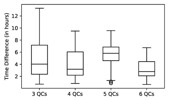 The differences between meta-heuristics were examined statistically. A significance level of was chosen for the whole study and corrected for each test using Bonferroni correction. To make general statements regarding the meta-heuristics, all scenarios (different numbers of QCs) are agglomerated. The large number of outliers for some of the meta-heuristics precludes the assumption of a normal distribution and requires a nonparametric approach. Hence, a Kruskal–Wallis H test was employed. The test statistic of leads to . Hence, the null hypothesis that the four groups stem from a single population is rejected. In a posthoc Nemenyi’s test for pairwise comparison, only TPE was significantly different from the other meta-heuristics. In other words, BO and SA are not significantly different from RS. The comparison of descriptive statistics (as the reader can approximate from Figure 8) shows the superiority of TPE in this study.