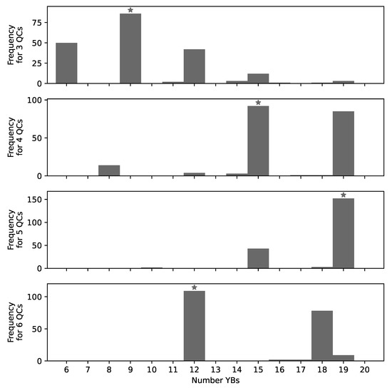 The number of YBs in the set of approximated optima. The parameter value that leads to the best objective function value over all optimization runs is marked with an asterisk.