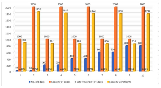 The calculation of the safety margin for the edges is based on formula (1). Note that the safety margin is determined by the number of edges and the edge capacities, and the meaning of the safety margin is the fraction of the maximum edge capacity that can be used by our algorithm. This is shown in Table 2, for edge numbers running from 20 through 800, and with edge capacities 1000 and 2000. For example, the second line in the table shows that for 20 edges and capacities of 2000 units the resulting safety margin is 0.926 (92.6%), which allows the usage of 1852 units of capacity, out of 2000 units. The content of Table 2 is represented graphically in Figure 1.