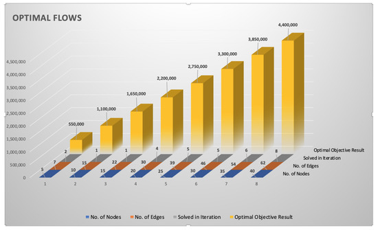 We ran the simulation with two different traffic types (two commodities in the multicommodity flow); they represent two source-terminal pairs, which were chosen randomly. Furthermore, the number of nodes and edges were varied: the nodes between 5 and 40, the edges between 7 and 62. The results are shown in Table 3. The table contains that for various numbers of nodes and edges, how many iterations were needed to find the optimum, and what was the optimum objective function value in terms of total carried traffic. The same results are represented graphically in Figure 3. The results allowed us to make some observations: