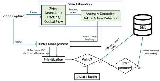 - Value Estimation assigns a value for each frame to be used in buffer management and storage prioritization. The value estimation module first executes object detection, object tracking [5], and optical flow estimation [35]. The outputs are then used in video anomaly detection and online action detection, which are used to compute the value. Details on this calculation can be found in Section 4.3. The value estimation method used differs significantly from [13]. In [13], perfect EOI detection using pre-defined rules was assumed, and the data value was computed based on detected EOIs. In this paper, we instead use video anomaly detection and action detection methods for generalized EOI detection and calculate the data value based on their output scores. More details on the value estimation of the original SBB can be found in Section 3.2. More details on our updated value estimation can be found in Section 4.3.