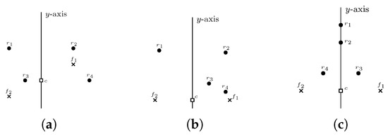 - Symmetry about the y-axis. If the robots and for , have the same configuration rank, i.e., , they are said to be symmetric about the y-axis. Let denote the symmetric image of r about the y-axis. If robots and are symmetric about the y-axis, then and . Similarly, two fixed points are said to be symmetric about the y-axis, if they have the same configuration rank. An active robot in its look phase identifies the set to be symmetric about the y-axis, if each robot position has a symmetric image . Similarly, a robot can identify whether the set F is symmetric about the y-axis or not. An active robot in its look phase identifies the configuration to be symmetric about the y-axis if both the sets F and are symmetric about the y-axis. Since the robots have an agreement on the direction and orientation of the y-axis, the configuration cannot admit translational symmetry or rotational symmety.