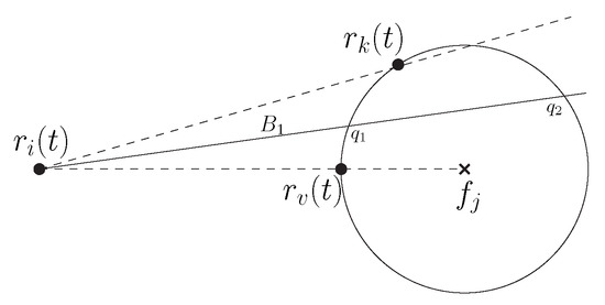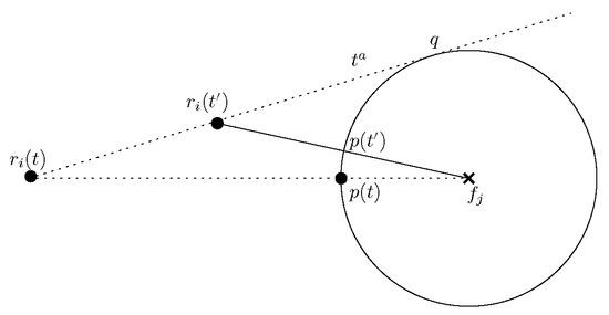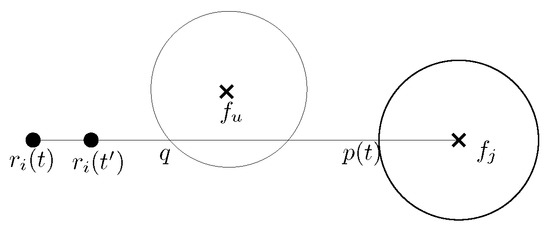 - Case 1. There is a unique target fixed point (say ) in the configuration. Lemma 5 ensures that each time a candidate robot gets activated, significant progress is ensured. If there is a unique candidate robot for , then Lemma 6 guarantees that until the candidate robot reaches its destination, it would remain the candidate robot. In case there are two candidate robots for , then Lemma 7 guarantees that until one of the candidate robots reaches its destination point, no other robot will become a candidate robot. As a result, one of the candidate robots will reach its destination point eventually. If the other candidate robot does not reach its destination point, then it becomes a candidate robot for when reduces by one. Thus, the circle formation process around all the fixed points will be completed eventually.