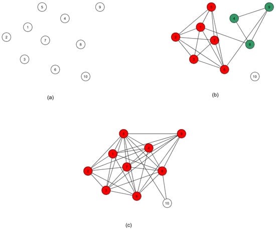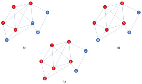 An illustration of the paraclique algorithm with glom term g = 2. (a) Starting with a maximum clique of size 4 as shown by red vertices, (b) paraclique first gloms onto vertex 5, (c) and then it gloms onto vertex 8 to form a paraclique of size 6.