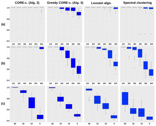 We compared the standard and greedy CORE-clustering algorithms (Algorithms 2 and 3) on these simulated datasets with two other graph-based clustering algorithms: the spectral clustering [30,31], available in the R-package anocva, and Louvain method for community detection [32], available in the R-package igraph. Note that the Louvain method requires as input parameter a graph modeling the dataset (the correlation matrix is transformed upstream into a graph) but not the final number of clusters. Boxplots of the computed scores R (see Equation (5)) are shown in Figure 1. Note that in each boxplot, the dots represent the outlier scores, which are either lower than or higher than , where and are the first and third quartiles of the scores, respectively.