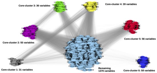The clustering obtained using the standard algorithm, rows 1 to 19 of Algorithm 2, is shown in Figure 2. In this figure, the represented clusters 1 to 6 have a coherence (see Equation (3)) equals to . Only the clusters 1, 3, 5 and 6 are then considered as CORE-clusters (rows 20 to 25 of Algorithm 2) and their representative variables are RV1 = YER190W, RV3 = YLL026W, RV5 = YDL003W and RV6 = YGL120C. Computational time for the clustering was about 160 s on an Intel(R) Core(TM) i7-6700HQ CPU at 2.60 GHz.