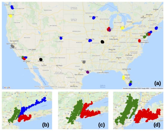 We show Figure 3, the CORE-clusters (Clusters represented using MI Map Tools: GeoPlotter: https://mobisoftinfotech.com/tools/plot-multiple-points-on-map/ (accessed on 19 February 2021)) obtained using the greedy algorithm with and . This means that each CORE-cluster contains a road network of to crossings, for which one can travel from any crossing to another one by only using streets of less than 3996 feet (about km) between two crossings. As expected, the clusters represented in Figure 3 correspond to the 18 largest urban areas in the U.S. Note that two of them are made of three CORE-clusters (New York City and Los Angeles), and two other ones (Miami and Chicago) are made of two CORE-clusters. This is due to an algorithmic choice, discussed in Section 3.2.2 and Section 3.2.3, which leads to the detection of CORE-clusters containing to nodes by using the proposed CORE-clustering algorithms. As discussed in Section 2.6, an interesting strategy if connected CORE-clusters are found consists in running again the CORE-clustering algorithms with higher values of or , to potentially detect more robust CORE-clusters: By reproducing this test with instead of , we now try to find CORE-clusters containing to crossings, only 5 urban areas are found: New York City (2 CORE-clusters), Los Angeles, Chicago, Miami and San Fransisco. Now, by using and now , i.e., with distances between the crossings lower than about 2000 feet (about km) instead of 3996 feet, only 3 urban areas are found: New York City (2 CORE-clusters), Los Angeles and Chicago.