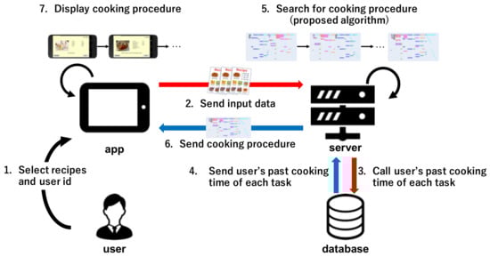 In the proposed system, the user first selects recipes from those displayed in the app and enters the user id. The input data are sent to the server, and based on the selected recipes and the user id, cooking information such as cooking time is retrieved from the database. The server searches for the optimal cooking procedure using “optimal cooking procedure search algorithm” and sends the result to the app. The user can use the app to confirm the cooking task s/he is doing now and should perform next while cooking.