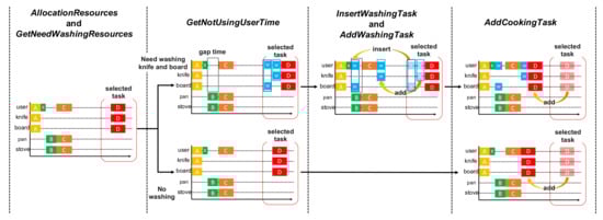 Next, the function retrieves the set of resources W in U that need the washing task. After that, the function obtains the set of gap time G during which the user can do the washing task. If the generated washing task can insert in G, it inserts into P by the function . If it cannot insert, it is added to P by the function . After all the washing tasks are added, the function adds e to P by prepending. Finally, the function determines whether O satisfies the continuity of the recipe.