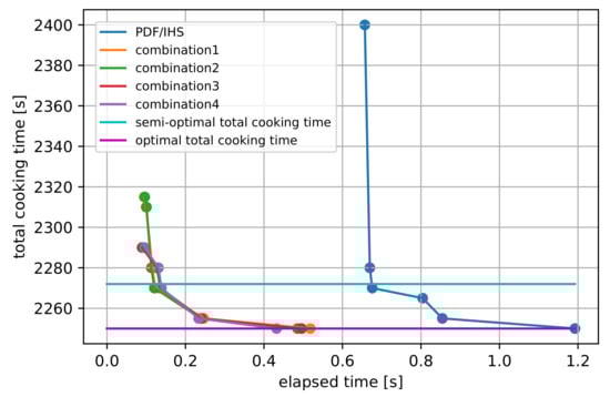 Table 4 shows the execution time, convergence time, and reached time of the five methods except for the SA. Here, each combination of two preprocessing and two bounding operations that we propose is denoted as combination 1 to 4, respectively. For menu 1, the shortest execution time is 1.32 s for combination 2, the convergence time is 0.43 s for combination 4, and the reached time is 0.12 s for combination 1 or 2. In addition, the execution time is less than 2 s for all combinations. For menu 2, the shortest execution time is 1202 s for combination 4, convergence time is 221 s for combination 4, and reached time is 6.36 s for combination 2. Regarding execution time, the base PDF/IHS performed the worst, with 2141 s execution time, which is 15 min longer than the fastest (combination 4). In all methods, the reached time is within 10 s.