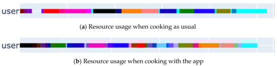 Figure 9 shows the usage of the resource “user” when the participant (ID = 1) cooks. Each horizontal bar represents a cooking/washing task. Horizontal bars of the same color common in Figure 9a,b represent the same cooking task except for the light blue color. The light blue horizontal bar represents the washing task. From Figure 9, we find that there is a time when the user is not doing anything when cooking as usual, but when using the app, the user is always performing a task.