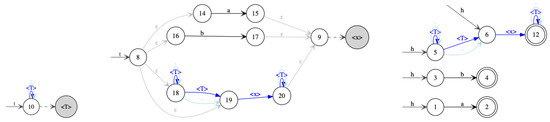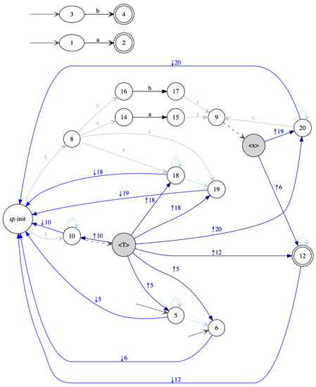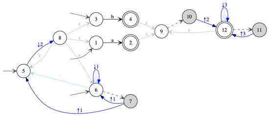 The next question is why the new determinization algorithms for that use s as intermediates work so nicely. In order to understand this, we need to investigate the relationship between and s more deeply. Clearly, the obtained via s do all their work in a bottom-up and left-to-right manner, and nothing when moving top-down. We can characterize the subclass of with this restricted behavior syntactically by the (weak) single-entry property: it requires that all opening rules of the go into into the same target state while popping the sources state onto the stack. Note that our single-entry property is weaker than the (multi-module) single-entry property studied previously [22,23,24], which in addition requires that the automaton can be split into at least 2 modules, one for the top level and one for the nested level. The obtained by compilation from s all have the (weak) single-entry property (but not necessarily multiple modules). Therefore, when compiling to s and back, the resulting also have the (weak) single-entry property. It seems that the usual determinization algorithm from is well-behaved when applied to with the (weak) single-entry property. The relationship between s and (weak) single-entry seems sufficiently close, so that their determinization algorithms seem to operate in somehow similar manners.