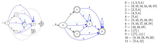 It is known that the subclass of deterministic multi-module single-entry (also called call-driven automata) enjoys unique minimization [22,23]. The separation of the module for the top level from the module for the nested level can be obtained w.l.o.g., by building a product with the with two hedge states that distinguishes the two levels. In our application, minimization could thus be used to reduce the size of the deterministic produced by our four algorithms for converting , with the hope to eventually obtain a unique outcome after minimization. However, as we will use some symbolic representations for sets of rules, the uniqueness will hold only for the non-symbolic counterpart. In any case, the number of states of the deterministic minimal obtained for the same could be expected to become unique.